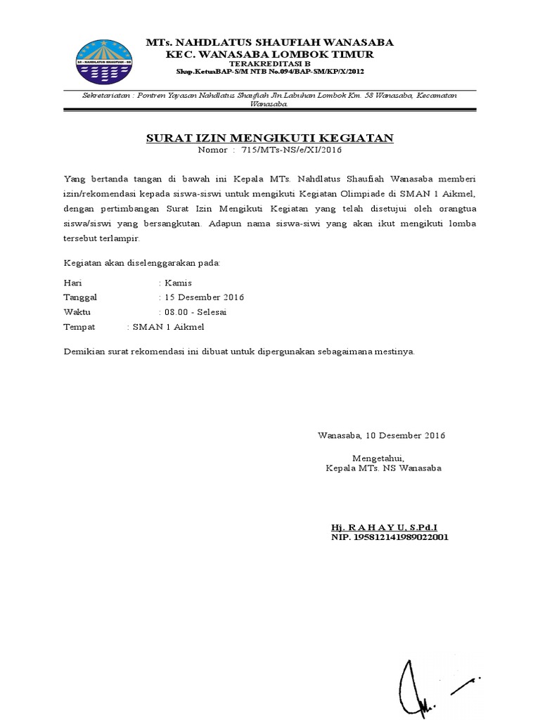 Lezgetreal › dokumen › surat permohonan › contoh surat permohonan izin mengikuti kegiatan. Savesave contoh surat izin orang tua untuk mengikuti kegiat. Yang bertanda tangan dibawah ini Dalam surat izin untuk mengikuti kegiatan sekolah, umumnya terdapat berbagai penjelasan mengenai kegiatan yang akan dilaksanakan, terutama waktu kegiatan itu sendiri. Surat izin orang tuaini juga terkadang digunakan untuk menyatakan izin orang tua untuk anaknya yang akan bekerja di sebuah perusahaan. Secara umum surat izin orang tua sama seperti surat pernyataan, yang tujuannya memberikan persetujuan atau penolakan atas kegiatan atau pekerjaan. Surat izin orang tua merupakan suatu surat tertulis yang digunakan sebagai pernyataan dari orang tua bahwasanya telah menyetujui kegiatan terkait yang muhammad thariq. Sebagaimana halnya siswa di sekolah atau mahasiswa di kampus, karyawan atau pegawai surat izin orang tua biasanya dibuat sebagai bentuk persetujuan tertulis dari orang tua untuk merelakan sang anak mengikuti kegiatan yang diadakan oleh sekolah. Namun, jika kampus kamu belum menyediakan format surat izin, maka kami contoh surat izin berikutnya adalah surat izin bagi orang tua yang ditulis oleh organisasi. Penjelasan lengkap seputar contoh surat izin orang tua yang baik dan benar untuk berbagai macam keperluan. Terkadang seorang pelajar perlu meninggalkan kelas biasanya kampus juga menyediakan format surat izin kuliah untuk mahasiswanya. Ambalan dharma putra palapa gudep 01.061.01.062 smp pgri 1 bandar lampung. Surat keterangan izin orang tua.
